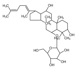 Ginsenoside Rh4 CAS Registry Number: 174721-08-5 Molecular Formula: C36H60O8 Molecular Weight: 620.865 Accurate Mass: 620.42882 Percentage Composition: C 69.64%; H 9.74%; O 20.62% Biological Source: Constit. of Panax ginseng Physical Description: Cryst. (MeOH aq.) Melting Point: Mp 160-161 Optical Rotation: []D +28.2 (c, 1.0 in MeOH)